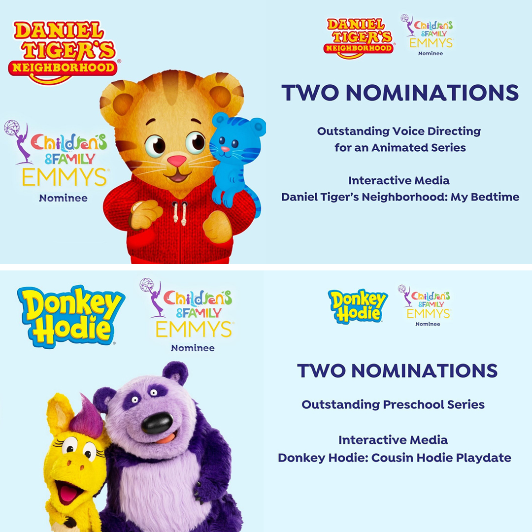 Our teams are extremely honored to have received four Children’s and Family Emmy nominations across both Donkey Hodie and Daniel Tiger’s Neighborhood. You can see the full list of nominees here. The categories recognized are as follows: